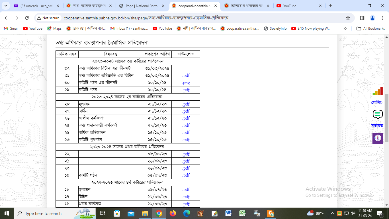 | ৩১ | তথ্য অধিকার প্রতিশ্রুতি এর রির্টান | ৩১/০৩/২০২৪ | |